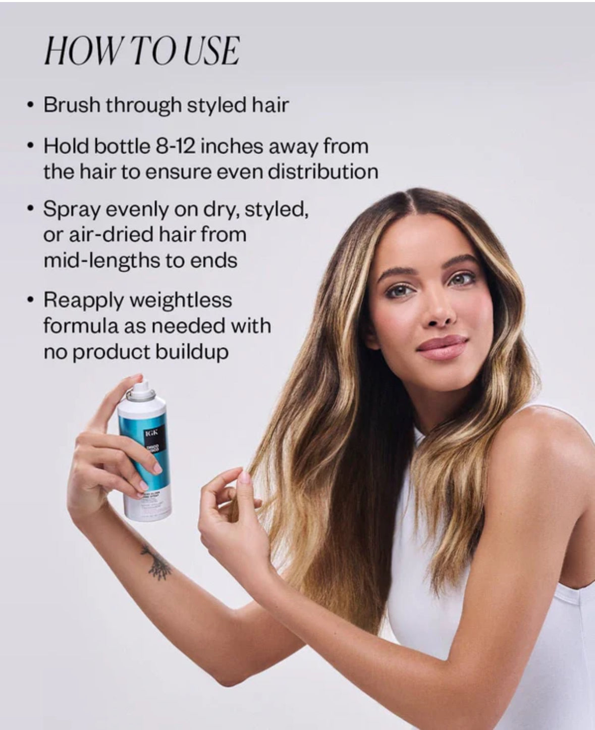A lightweight, high-shine finishing spray that instantly provides a glassy protective glow to all hair types with no greasy residue. Powered by a highly-refractive Patented Gloss Filter to enhance hair gloss and color, and UV protection to prevent color fading. This finishing spray creates a protective shield against UV damage, pollution, static and heat.