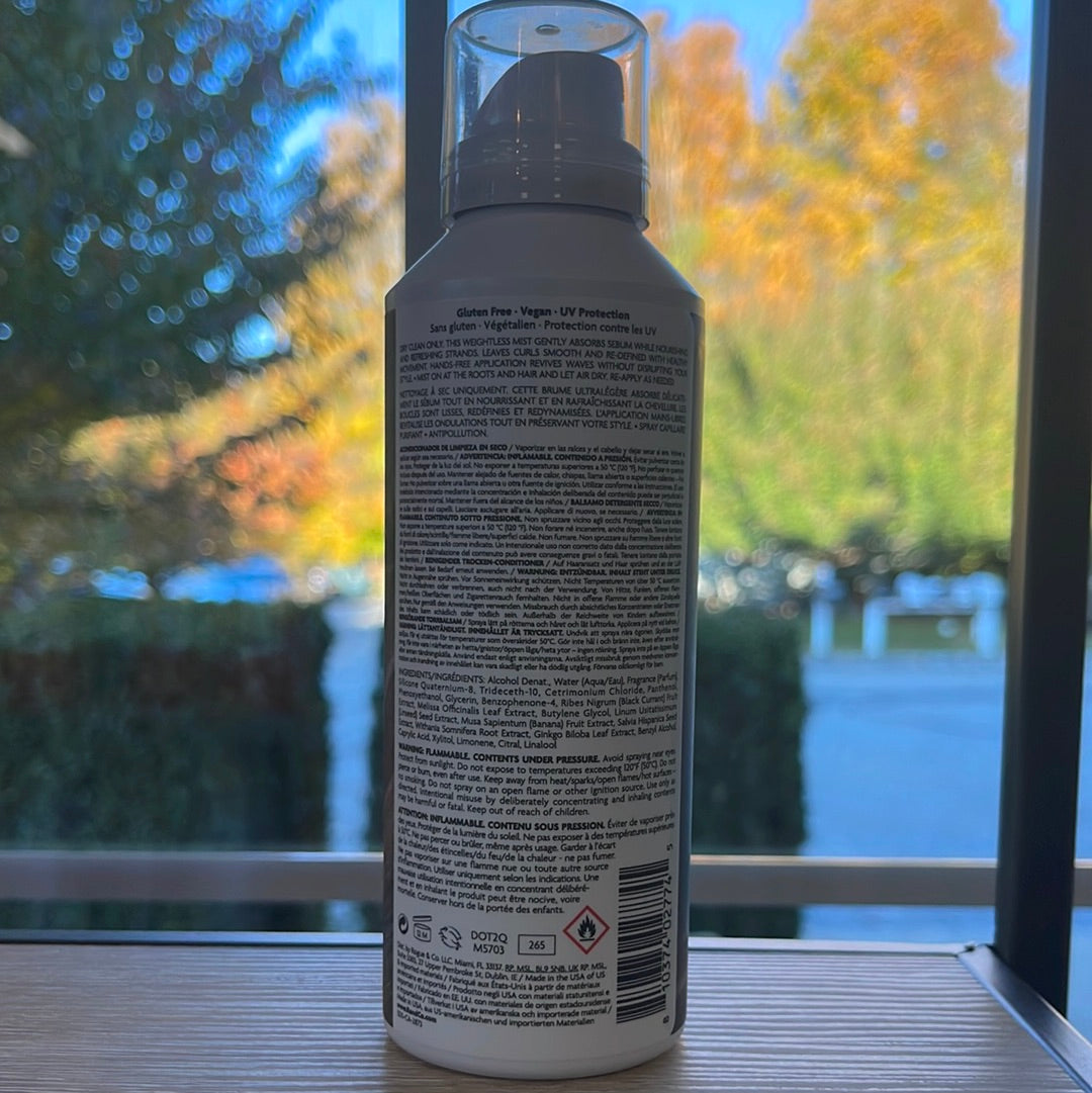 Dry clean only. This weightless mist gently absorbs sebum while nourishing and refreshing strands. Leaves curls smooth and re-defined with healthy movement. Hands-free application revives waves without disrupting your style.